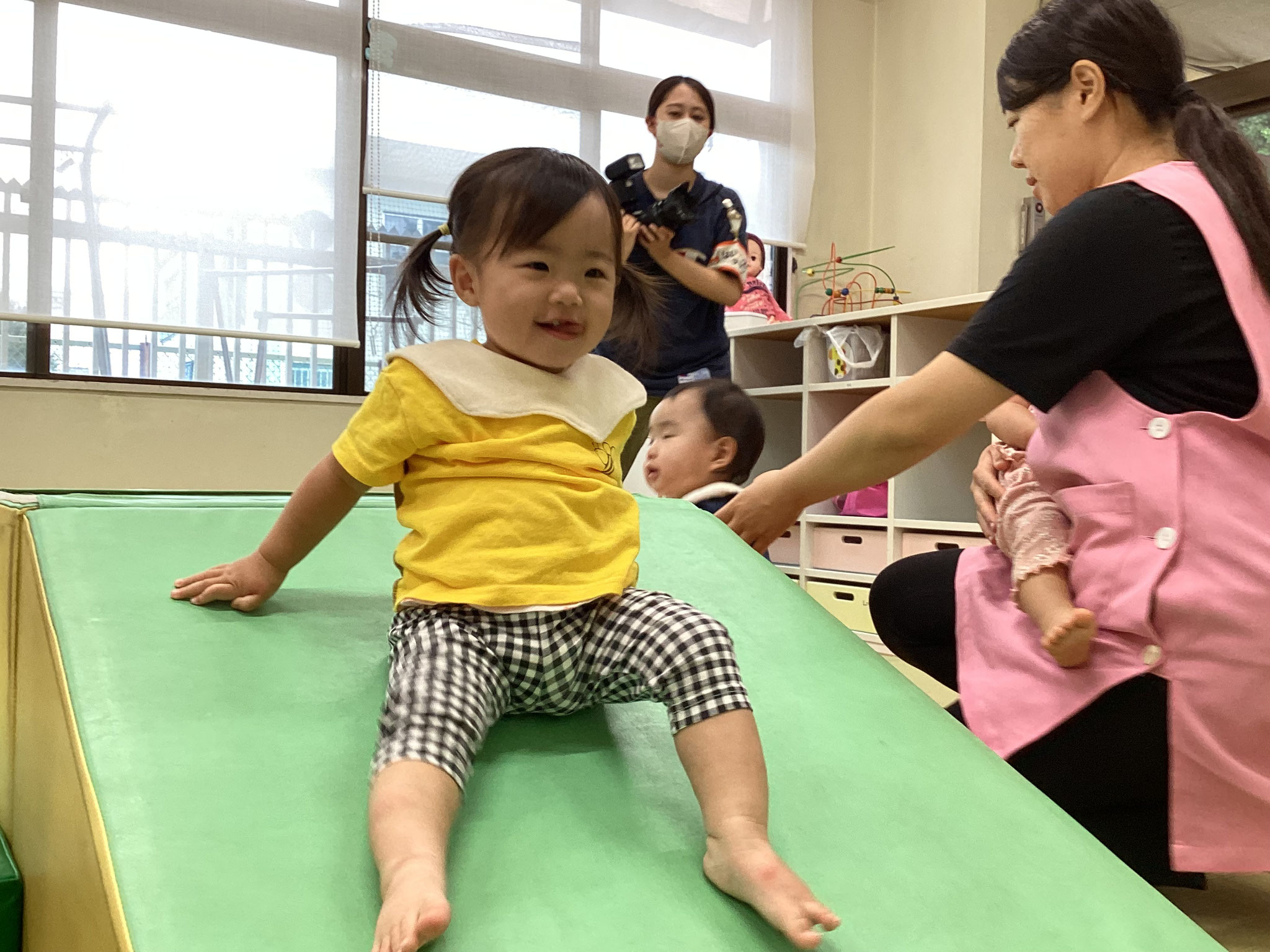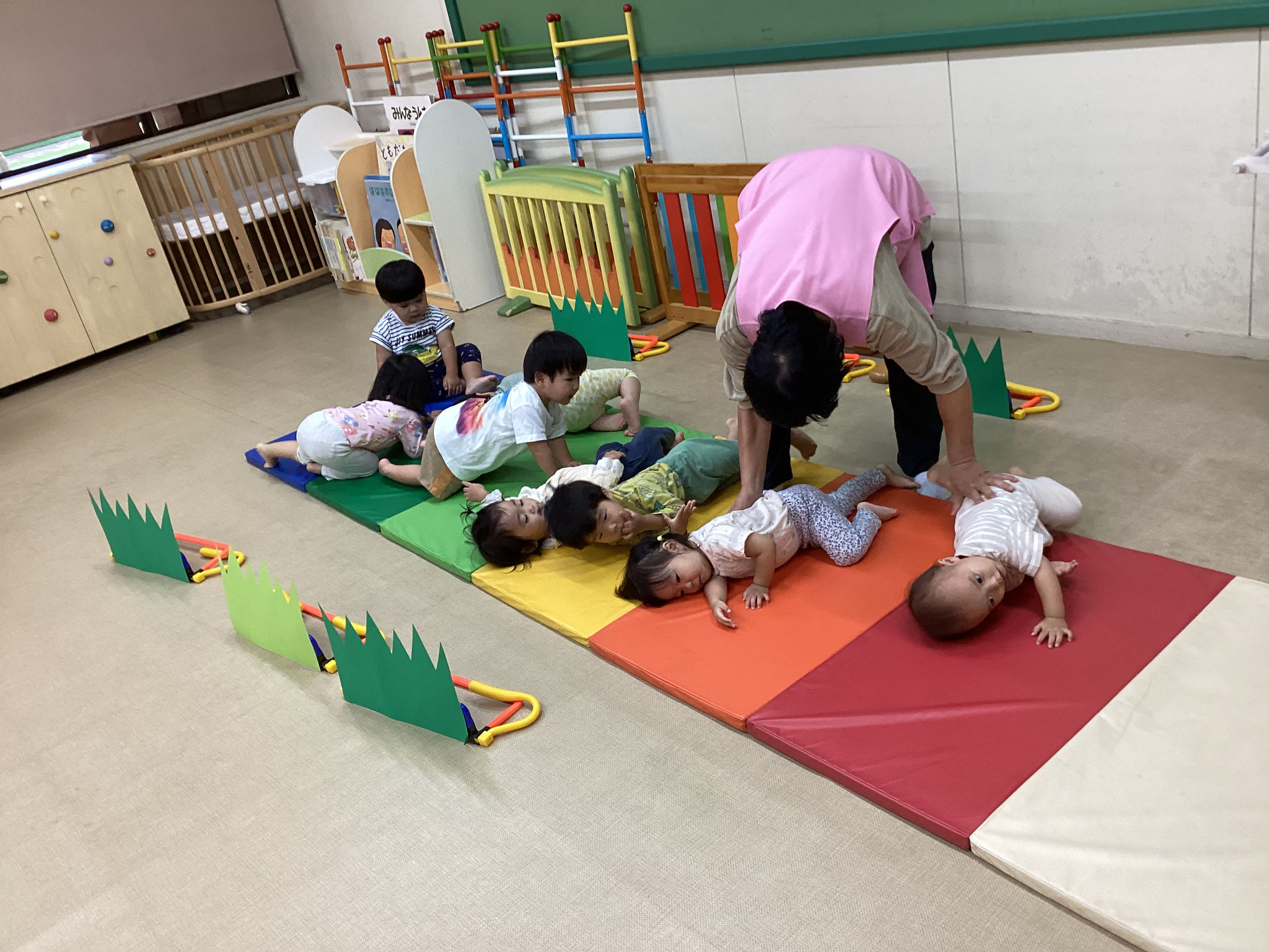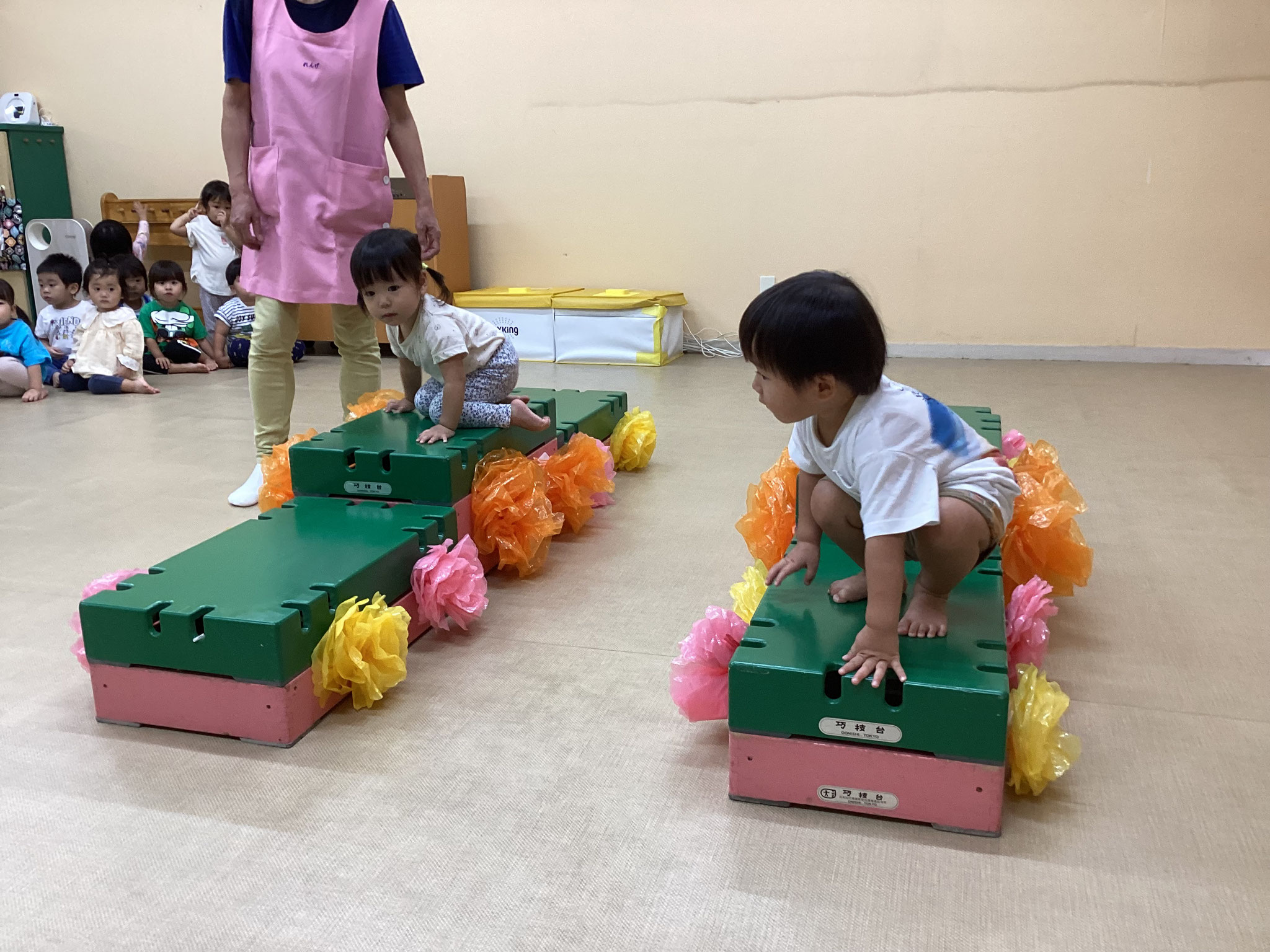 巧技台の階段は一生懸命手や足を使って登って歩きます。マットは寝転んでコロコロ転がります。中々難しいけれど頑張りました。最後は手押し車に乗ってゴールです。