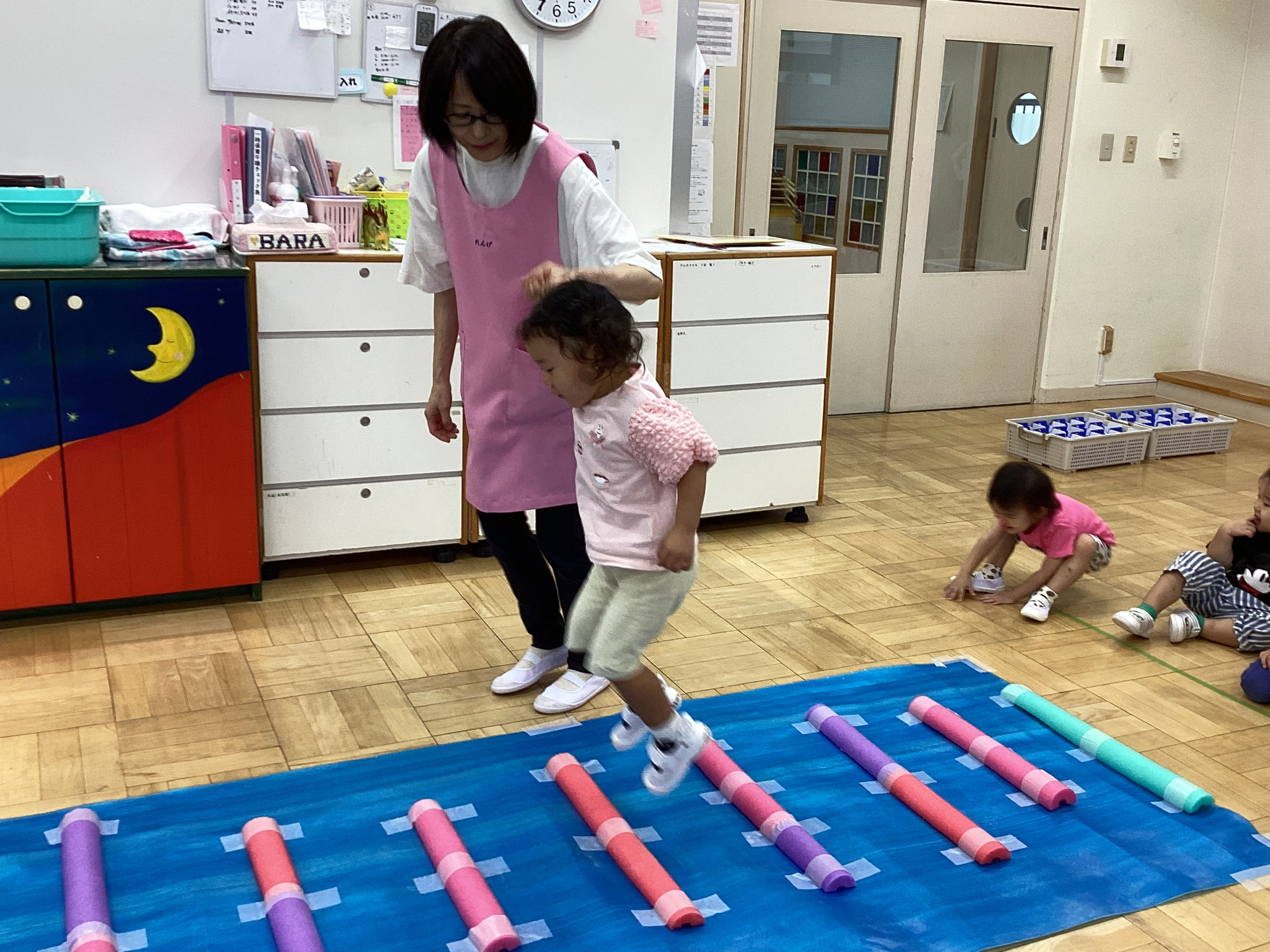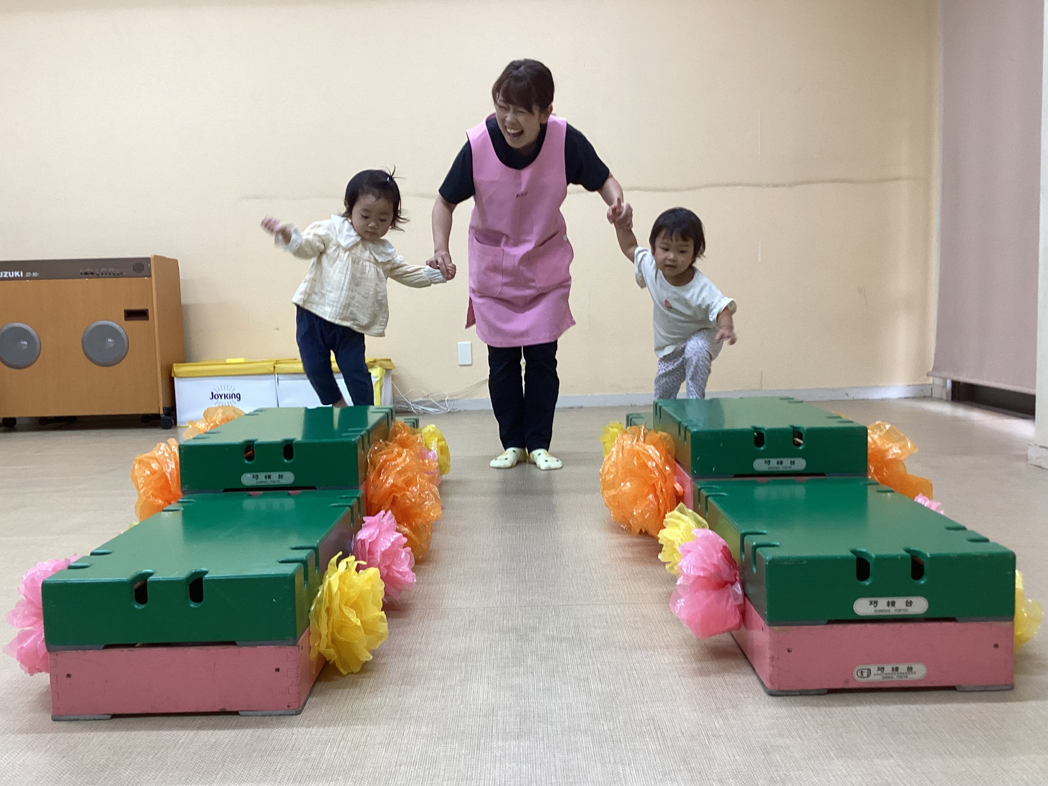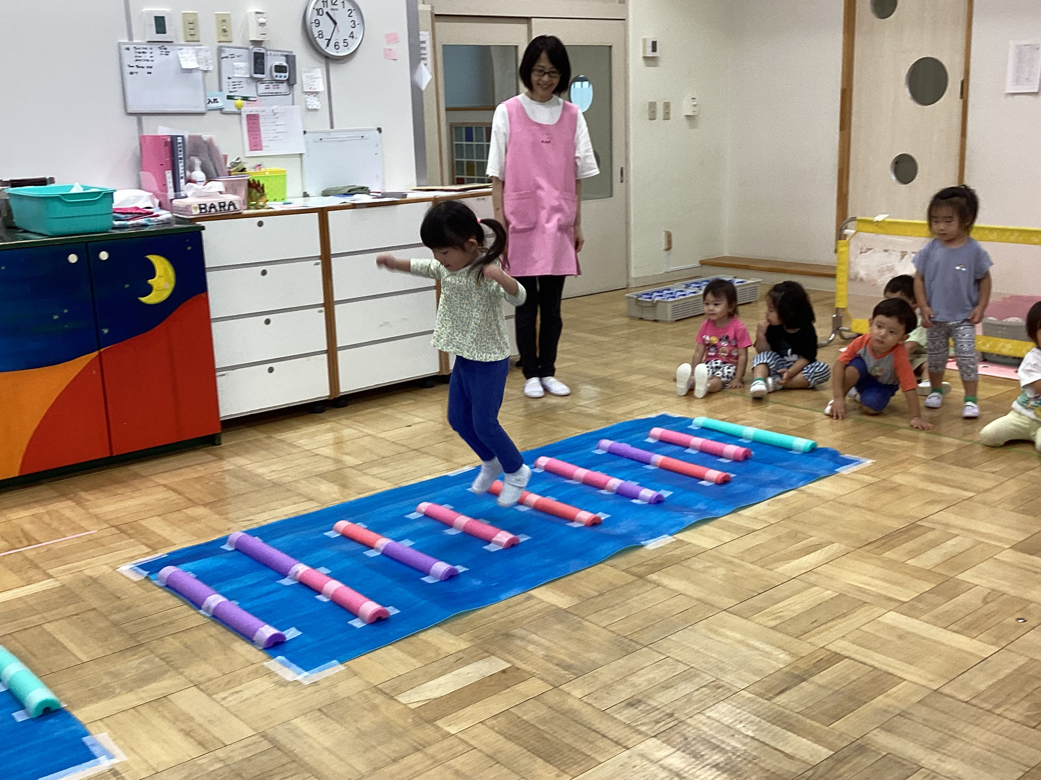 両足を揃えてリズミカルにジャンプして、保育者と手をつないでゆっくりと慎重に平均台を渡ると、最後はスズランテープでお水に見立てたすだれを笑顔でくぐっていました。