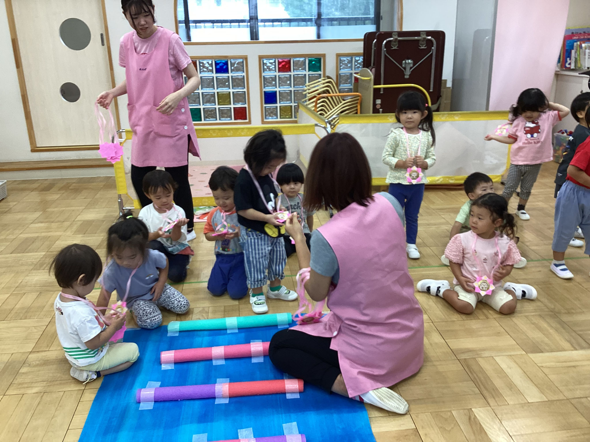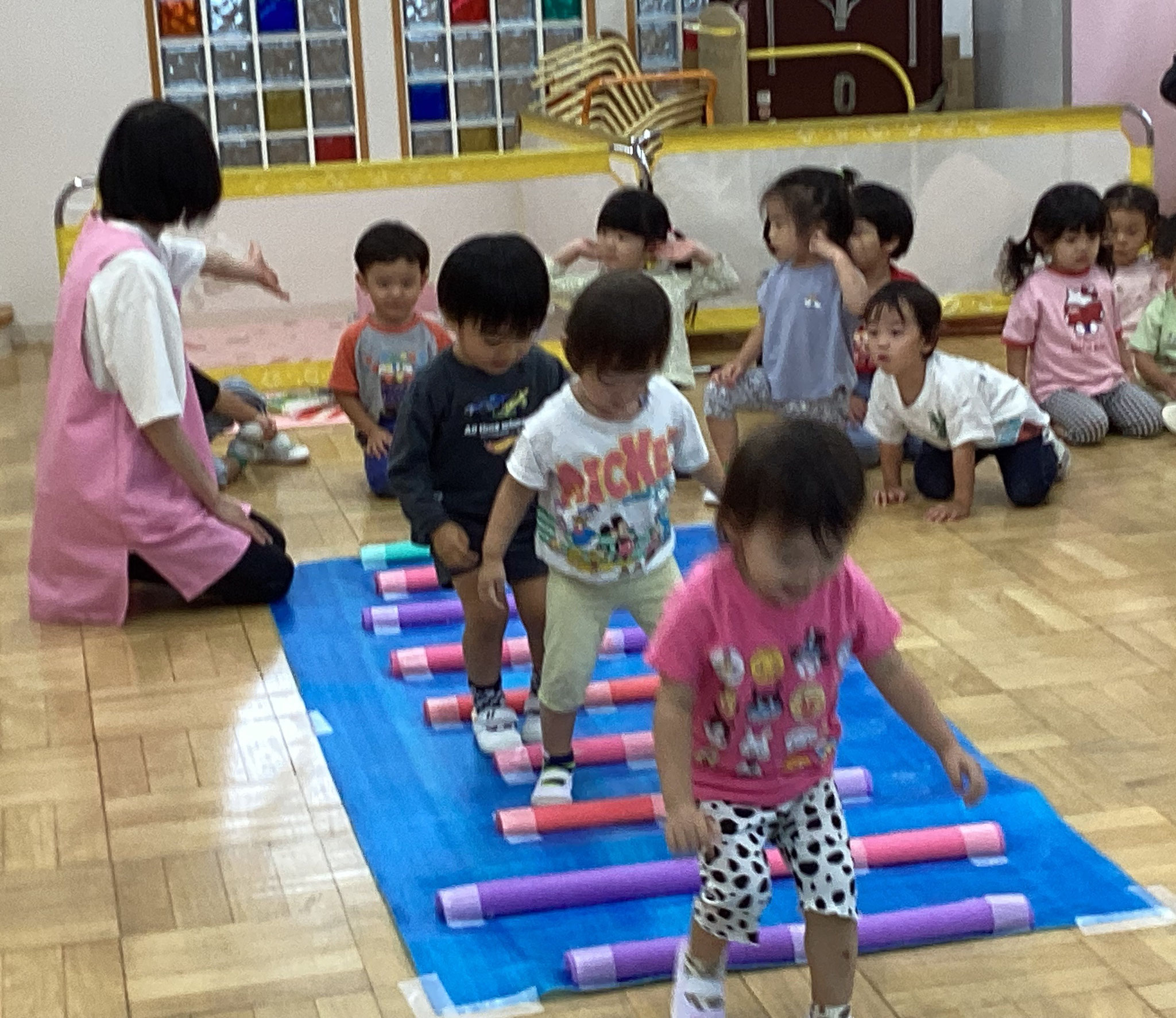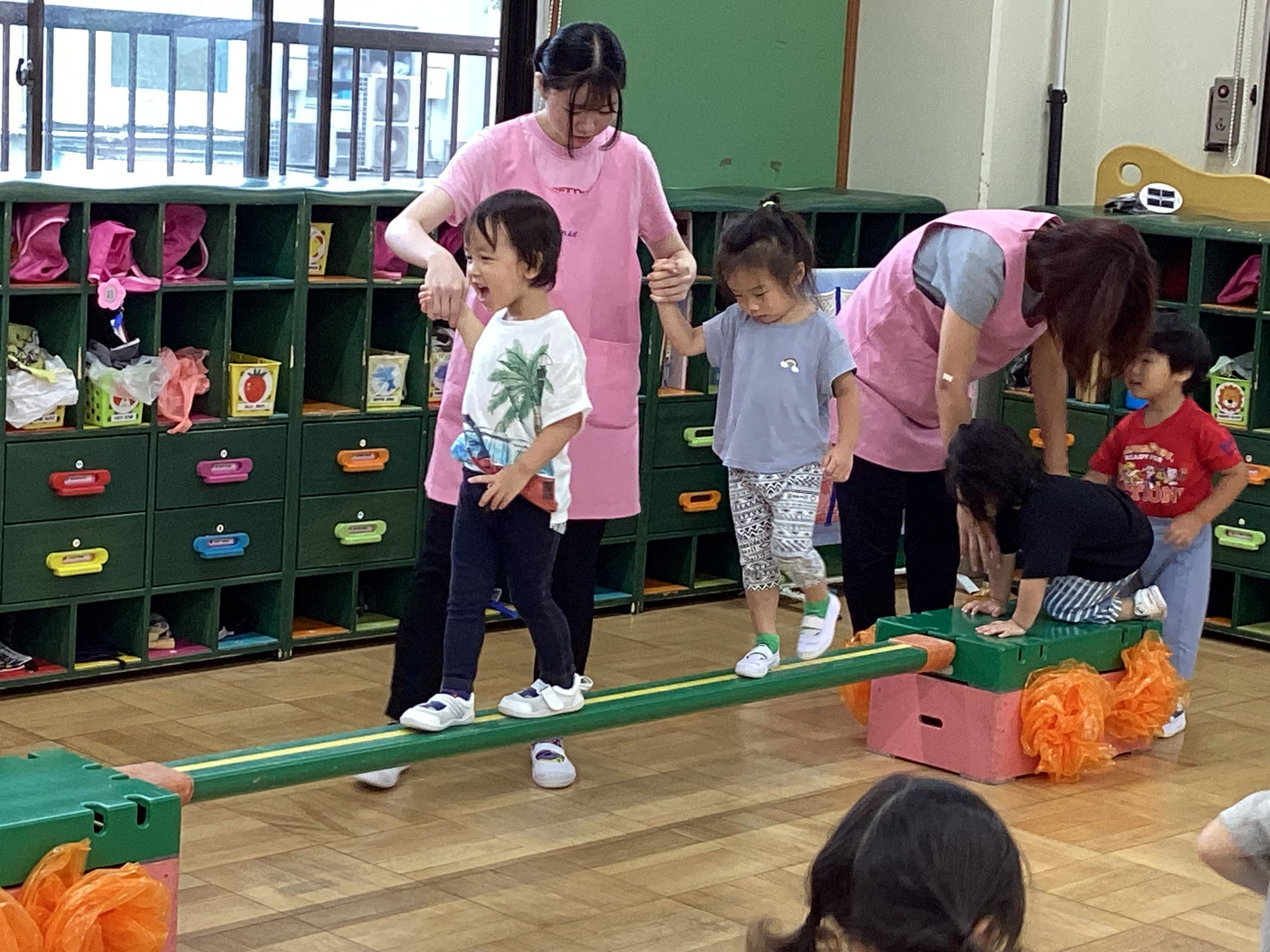 両足を揃えてリズミカルにジャンプして、保育者と手をつないでゆっくりと慎重に平均台を渡ると、最後はスズランテープでお水に見立てたすだれを笑顔でくぐっていました。