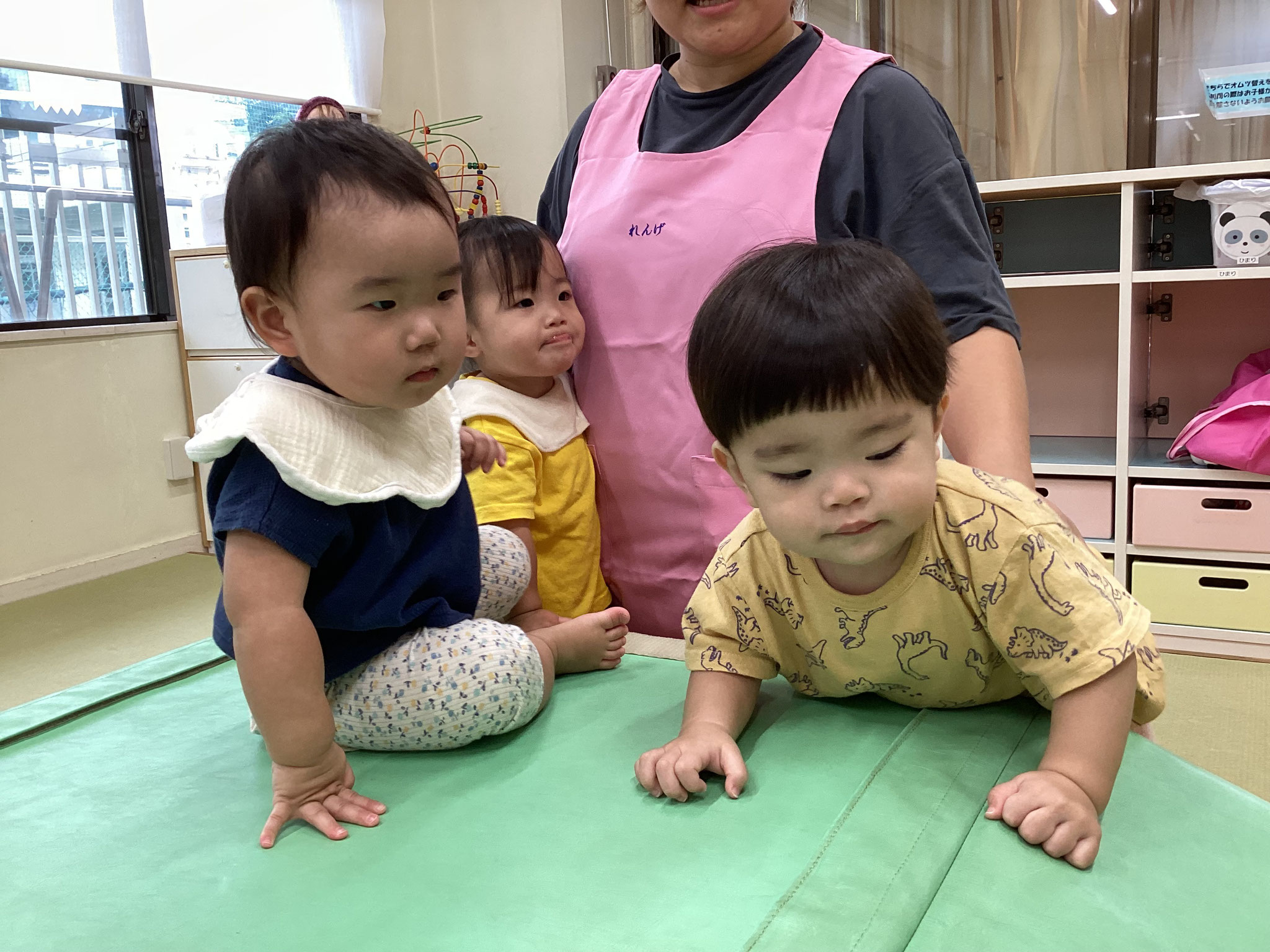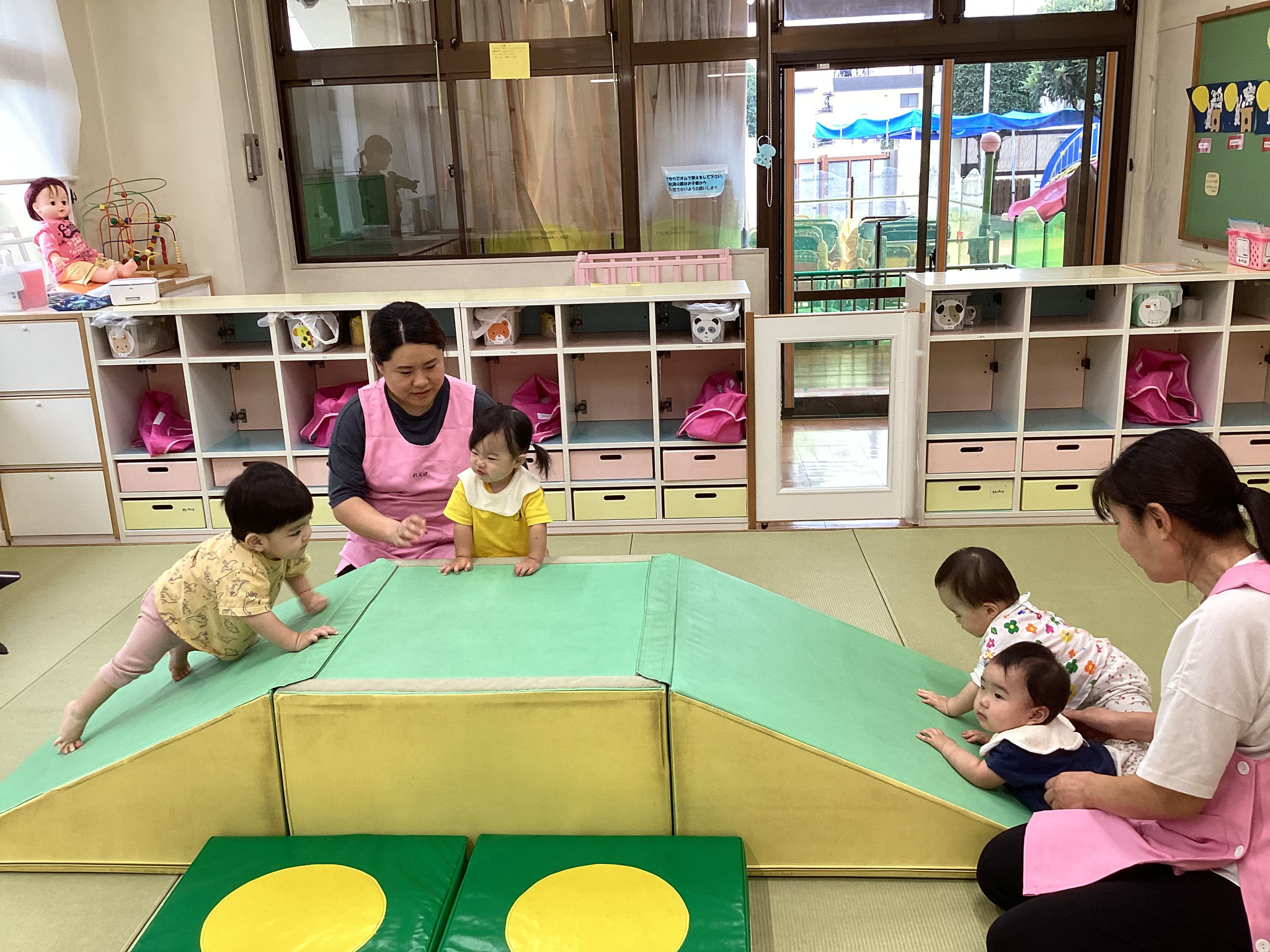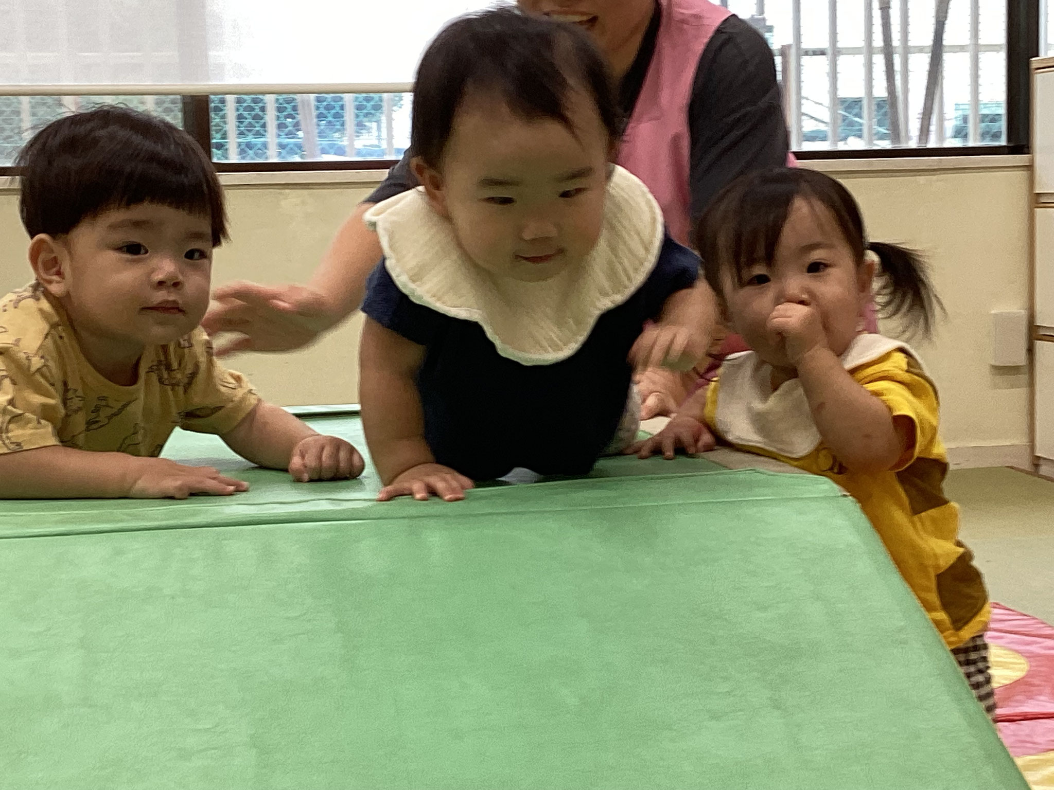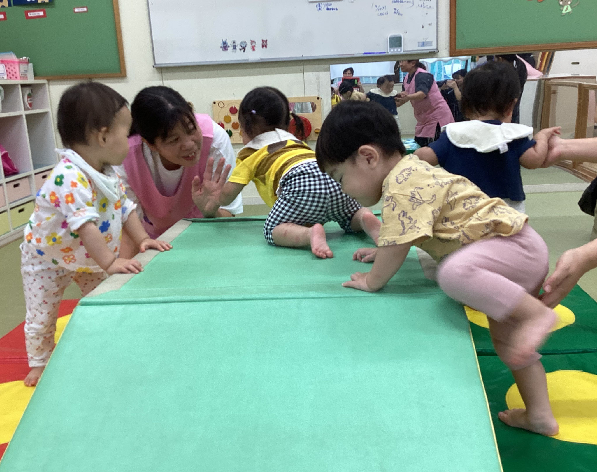マットを出すとすぐに手足を使って「よいしょよいしょ」と力強く登っていく子どもたち。